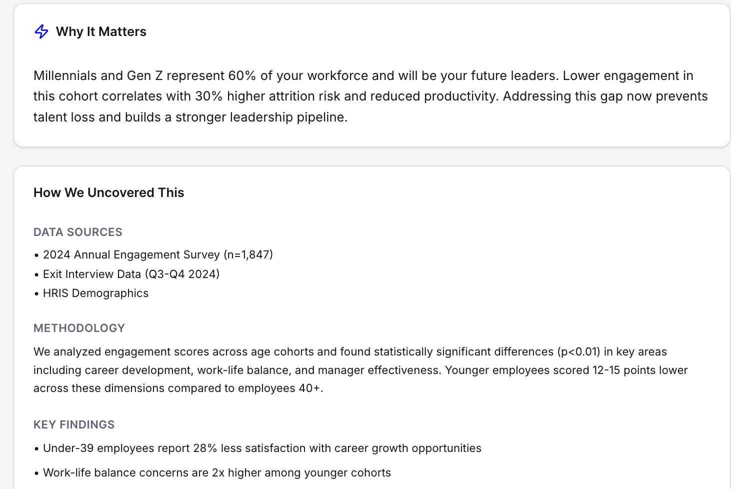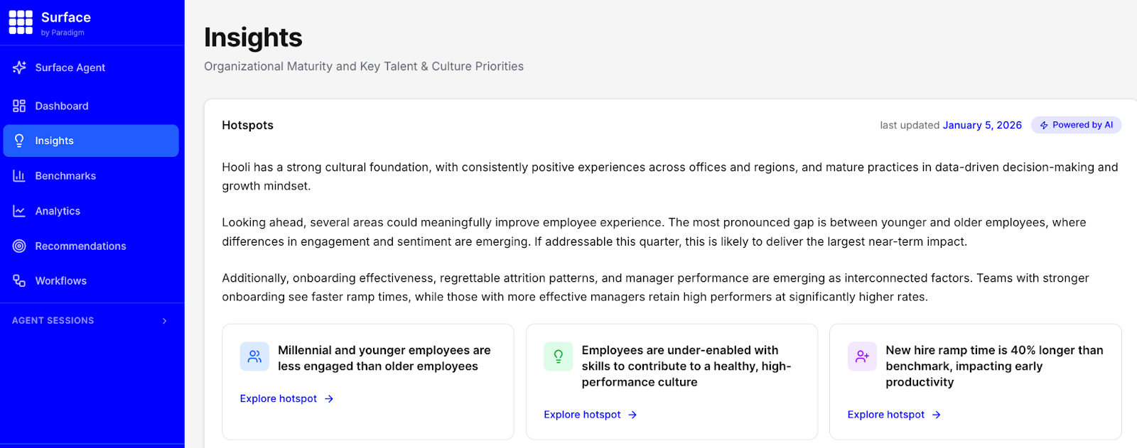 Hotspots provide an executive summary for your organization, highlighting the things that are going well and your biggest opportunities. Paradigm experts have spent over a decade analyzing data to uncover gaps, understand why those gaps exist, and provide data-driven and research-backed recommendations to address those gaps. Our prompts in Surface harness that expertise to identify gaps in real time, and triangulate several data sources to pin-point the root of the cause. The result is robust insights and tailored solutions.