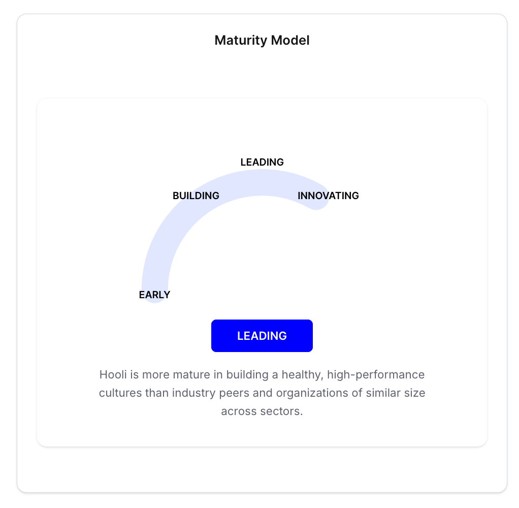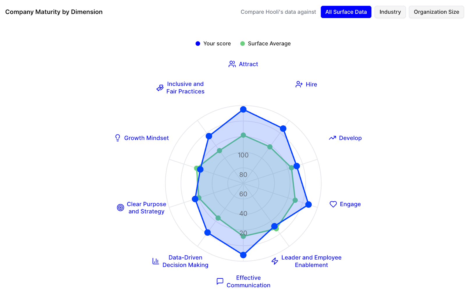 Surface not only provides an overall maturity score, that score is broken down by ten dimensions that are critical to creating a high performance culture. Maturity is broken down by two categories (and most questions are tagged with each of these categories): Employee Lifecycle dimensions - Attract, Hire, Develop, and Engage, and Organizational Health Dimensions - Leader and Employee Enablement, Effective Communication, Data-Driven Decision Making, Clear Purpose and Strategy, Growth Mindset, and Inclusive and Fair Practices.