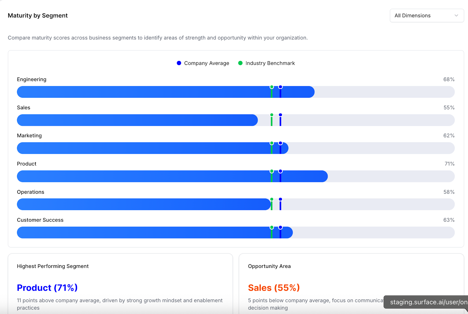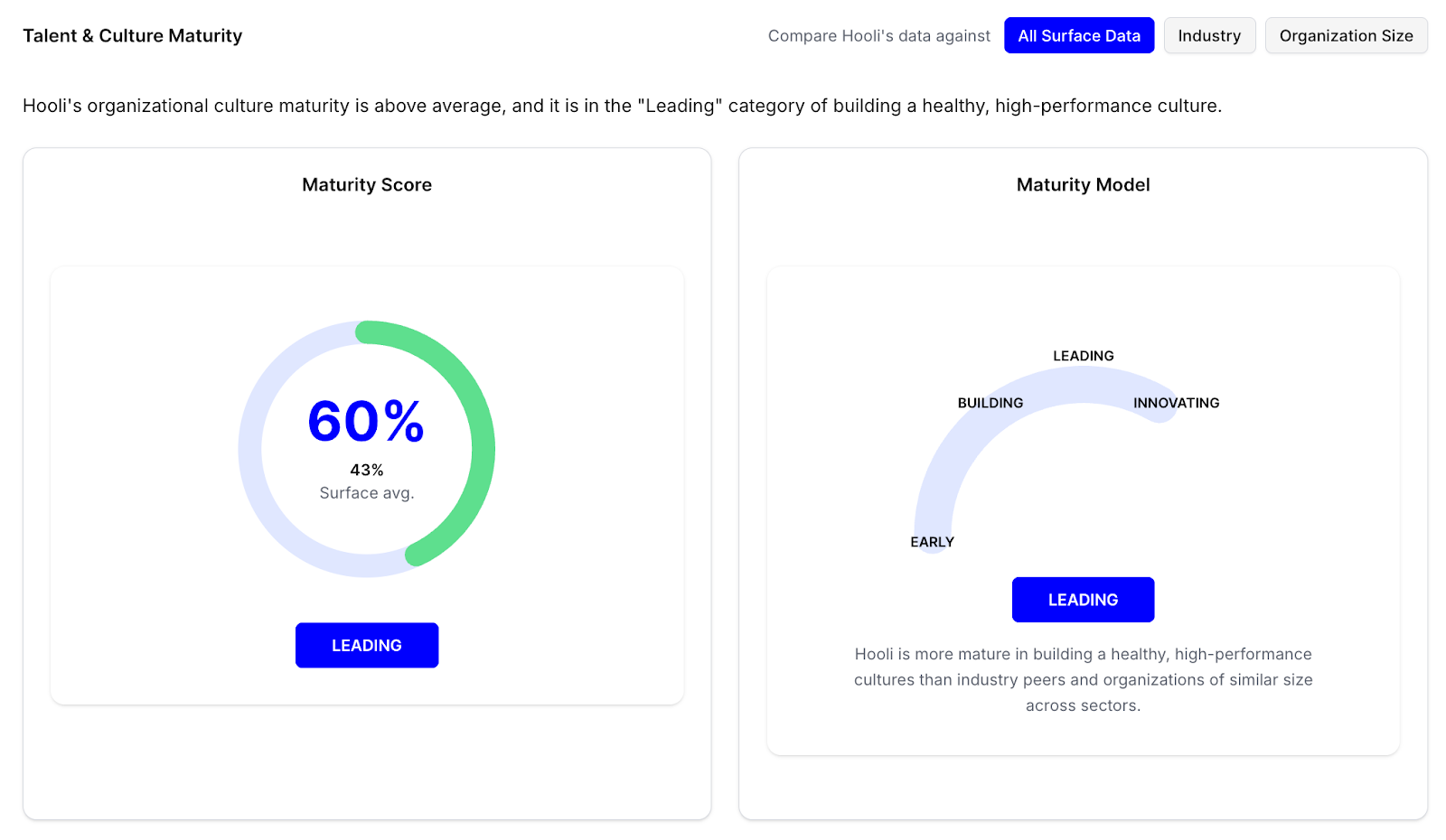 Each company gets a maturity score that places them on our maturity model, a scale where your placement is determined by how your maturity score compares to benchmark. You can compare to All Surface customers (the default), your industry, or companies of your size. Maturity model distinctions are as follows: Early (more than ten percentage points below the benchmark), Building (within ten percentage points of the benchmark), Leading (more than ten percentage points above the benchmark), and Innovating (more than 25 percentage points above the benchmark)