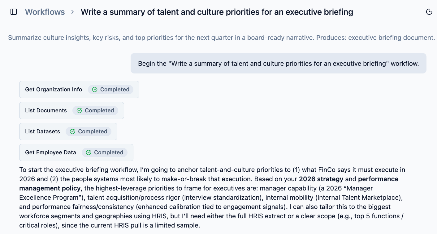 Workflows will show you the steps its taking to get work done, and ask you questions to further tailor and refine its work. The result is expert-informed, tailored output. This feature enables you to spend less time sharing context with generic AI and refining your own prompts, and more time getting things done.