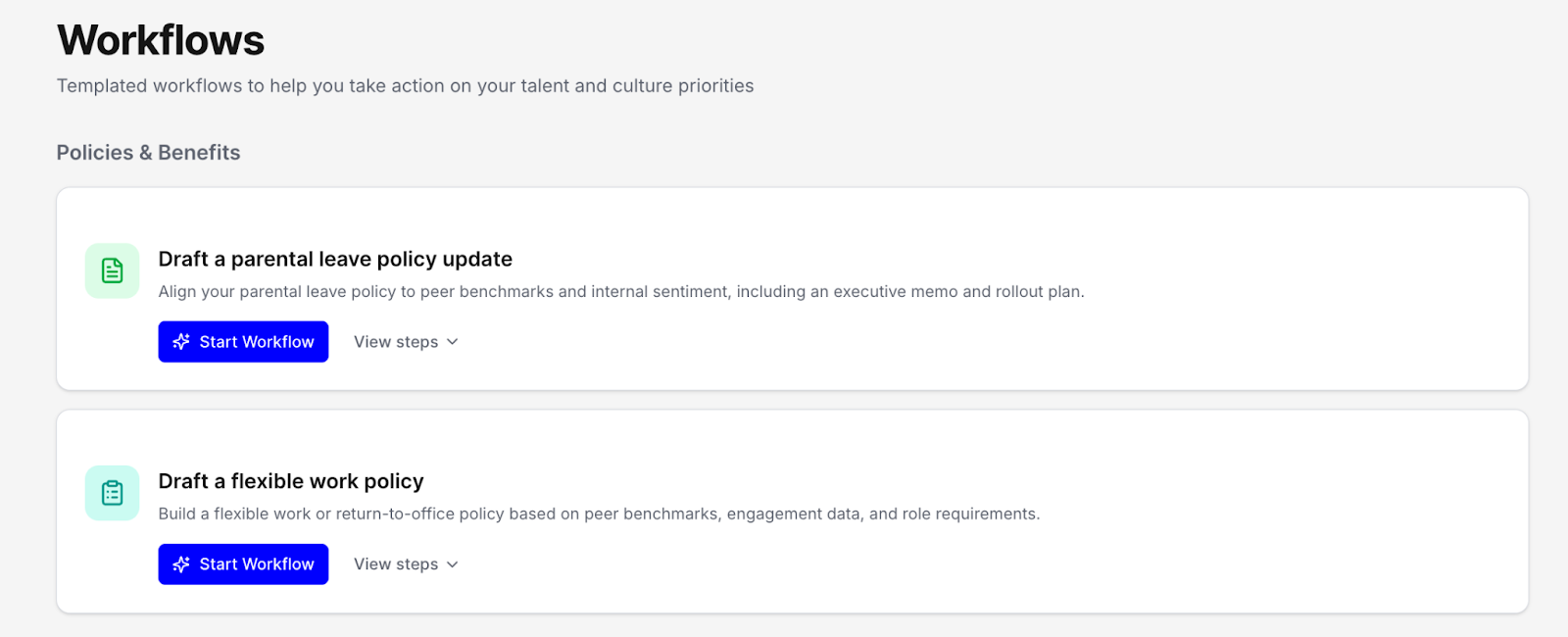 Helping you get things done is one of the core tenets of Surface, and Workflows is a feature designed to help you do just that. Carefully designed and maintained by Paradigm experts and the latest cutting edge research and benchmarks, we’ve built workflows that help you get things done in a way that’s unique and tailored to your organization. You can use any of our pre-built workflows to draft an updated PTO policy, write an executive briefing, benchmark your performance management process, or design a manager training program.