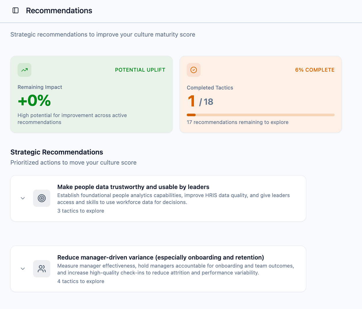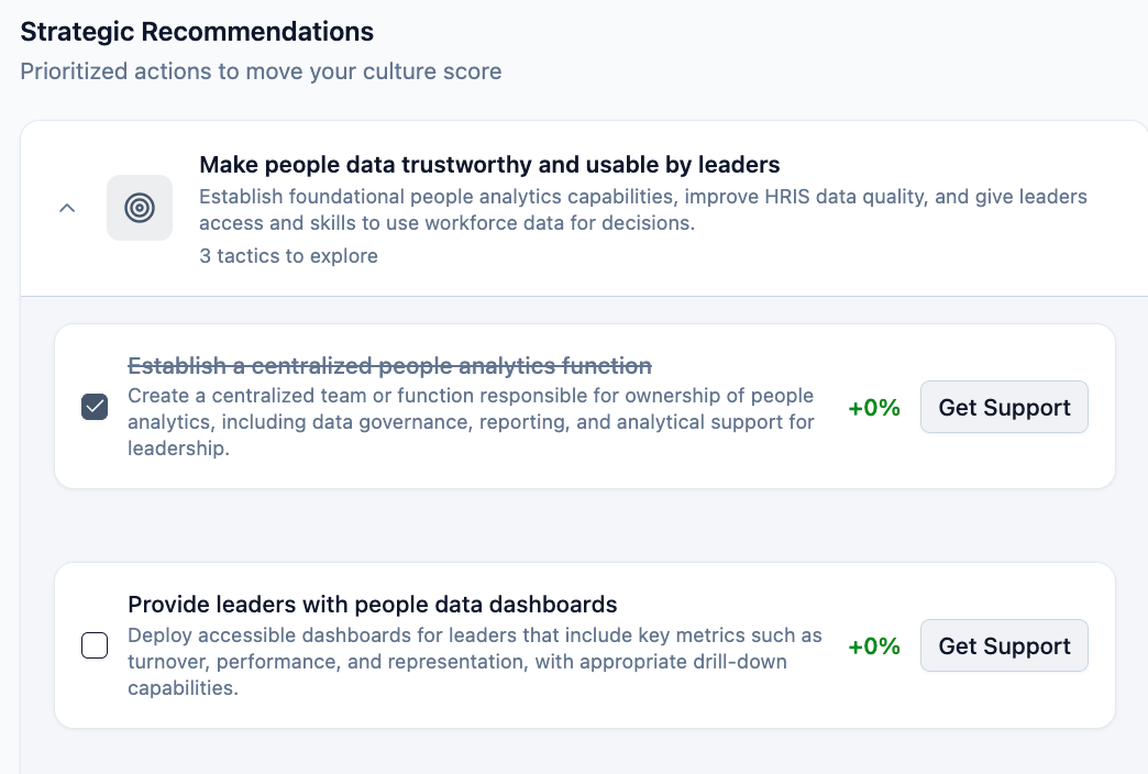 Based on all of the data and context we gather through the Company Context Library, Surface gives you tailored recommendations to help you move the needle and address your biggest priorities. Organized by key topics, like "Make data trustworthy and usable by leaders", you can understand where you need to take action, and get detailed recommendations on the steps you can take to drive meaningful change.