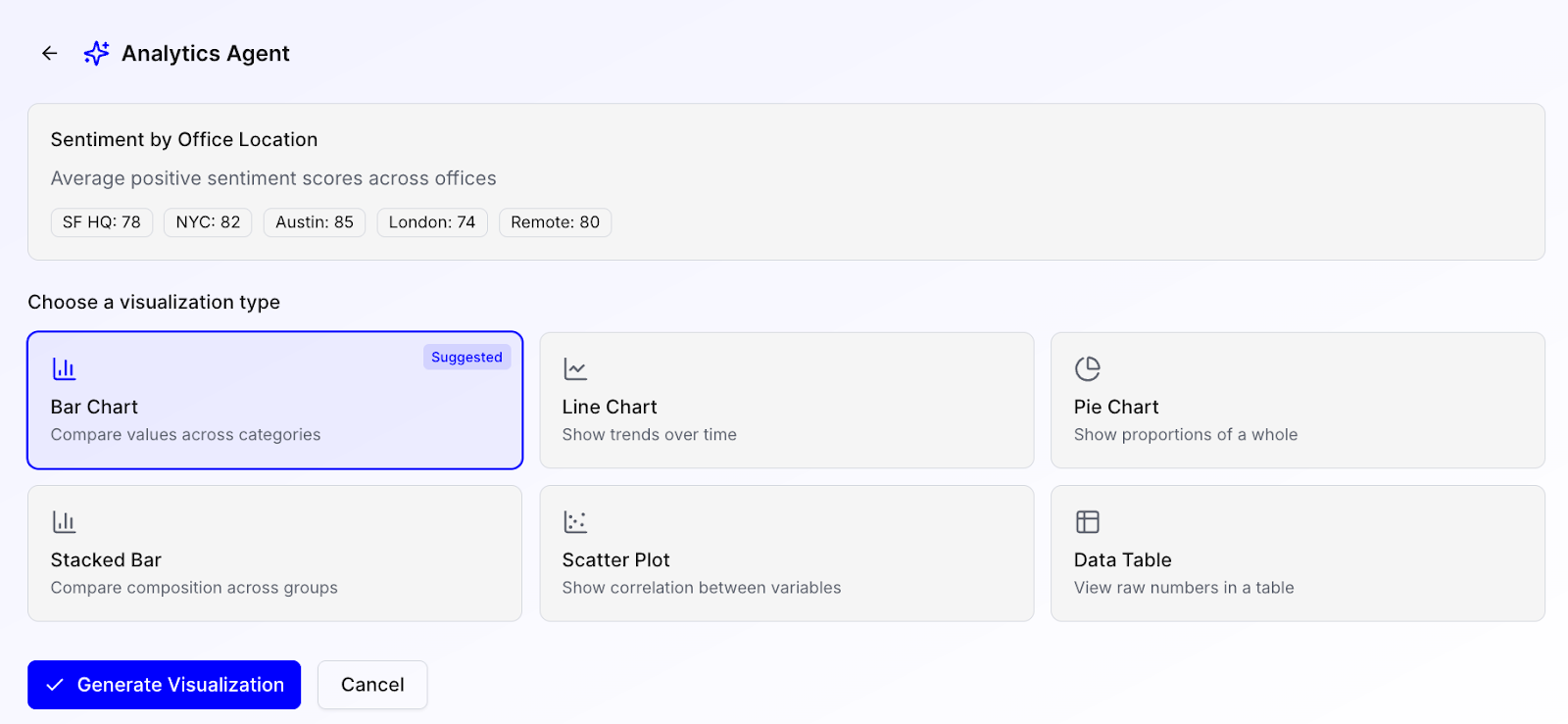 For example, you can ask the Analytics Agent to compare sentiment across locations. It will first preview the data and ask what type of visual you want to create (see below).